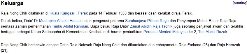 Wikipedia Raja Nong Chik yang perlu diperbetulkan maklumatnya. Pertama, beliau bukan kerabat diraja Perak dan keduanya isterinya seorang mualaf Cina tidak boleh menggunakan nama gelaran "Raja" |
